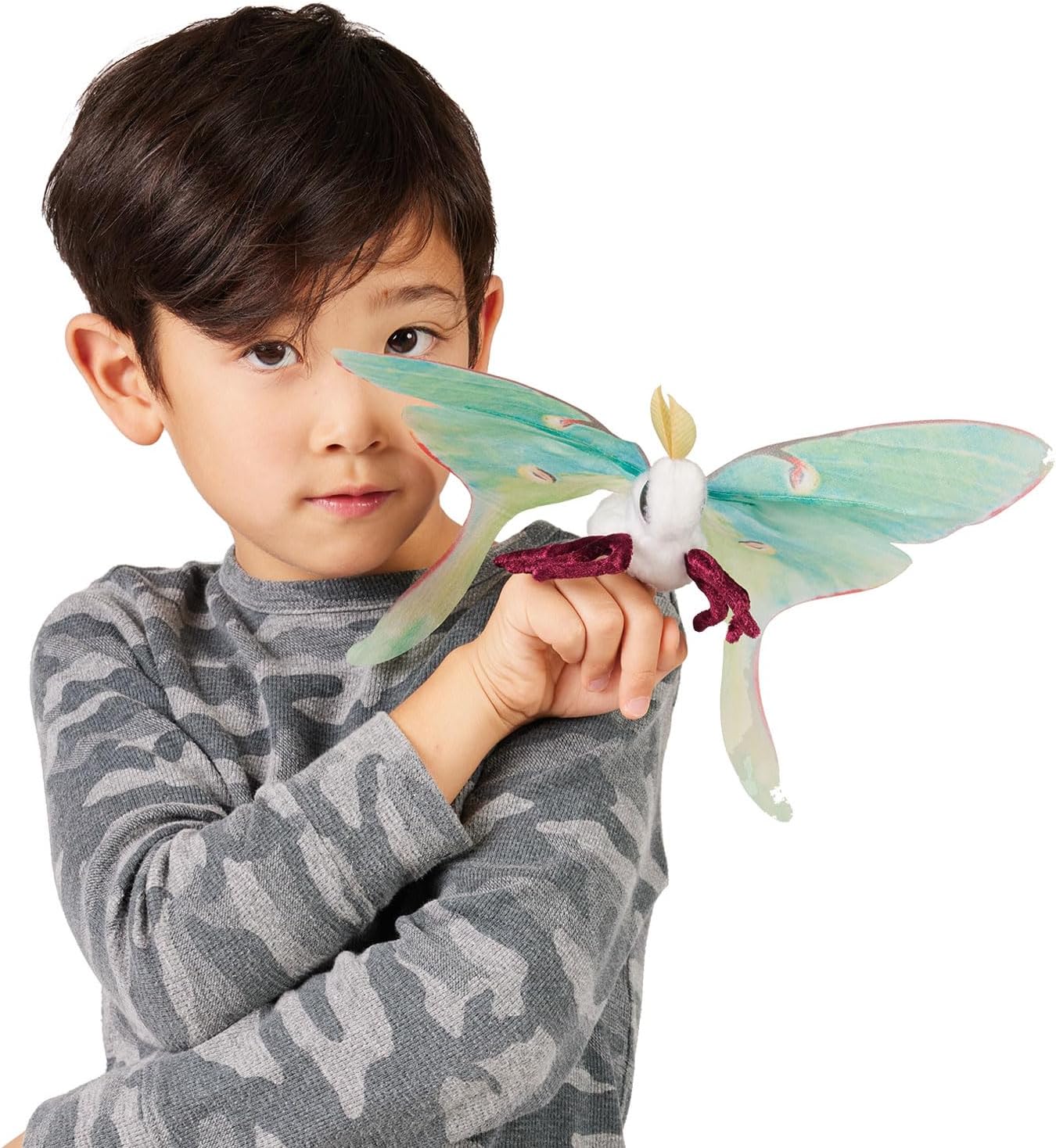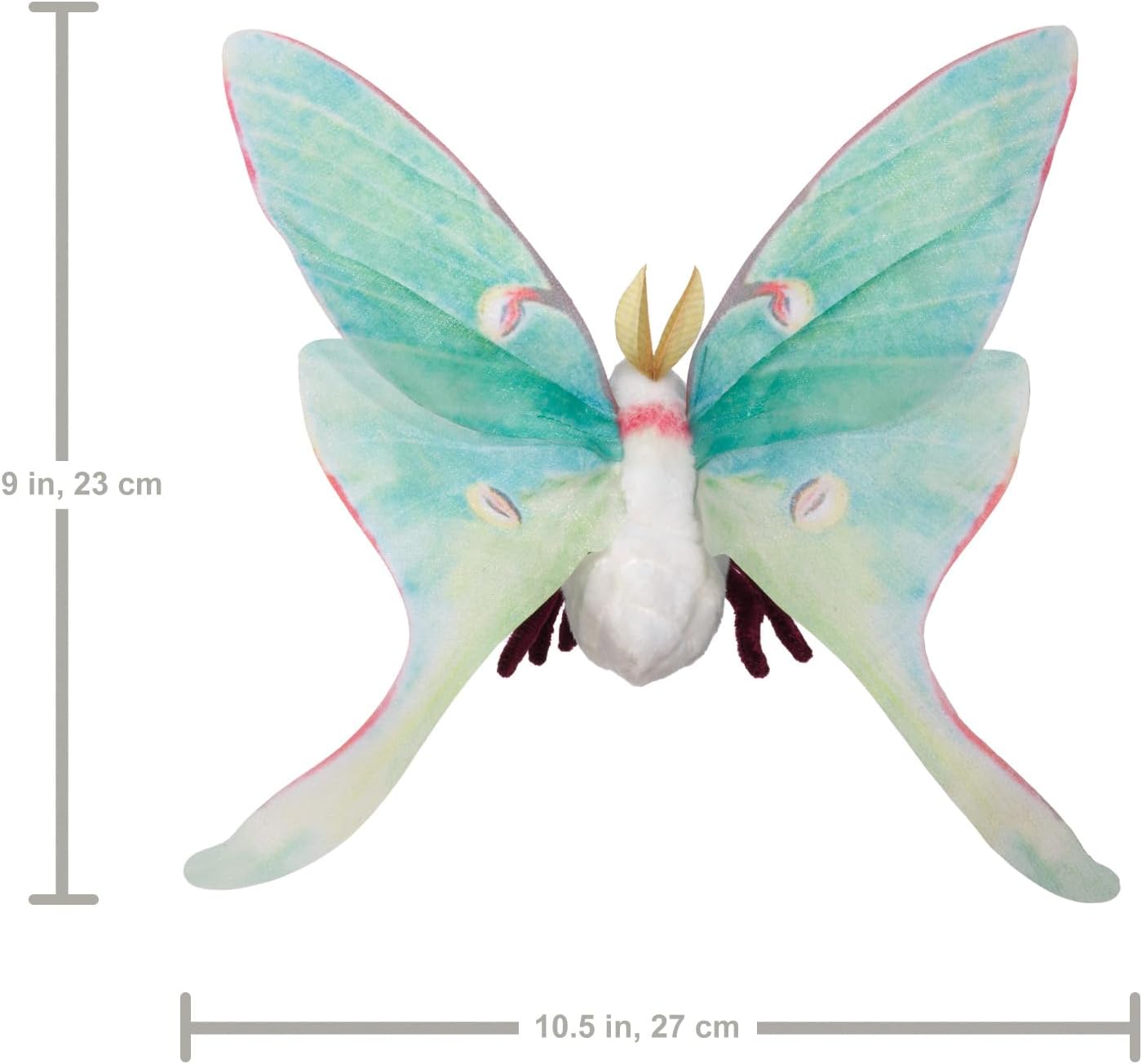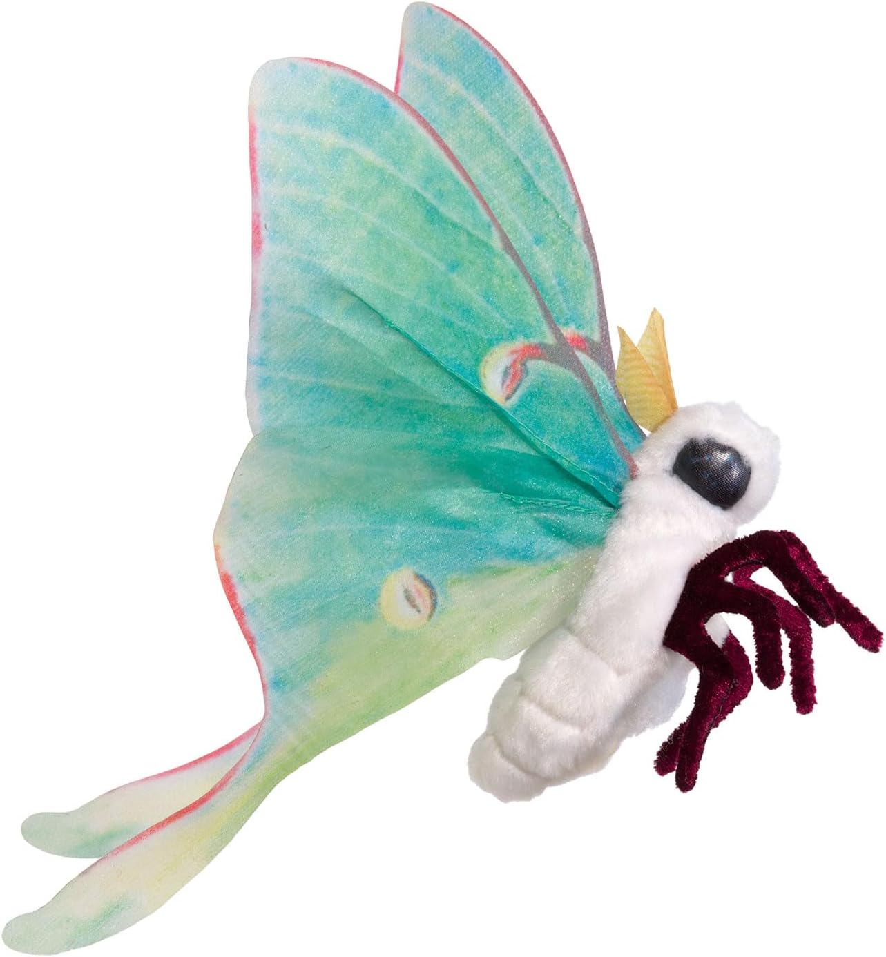 Beautiful and ethereal, the enchanting Mini Luna Moth finger puppet will capture your boundless spirit. This alluring moon moth puppet, native to North America is the only moth ever depicted on a US postage stamp and has silky printed organza wings on a sleek stretch velour body to flutter and dance on your fingertips. This puppet measures 9 x 10.5 x 4 inches (LxWxH).