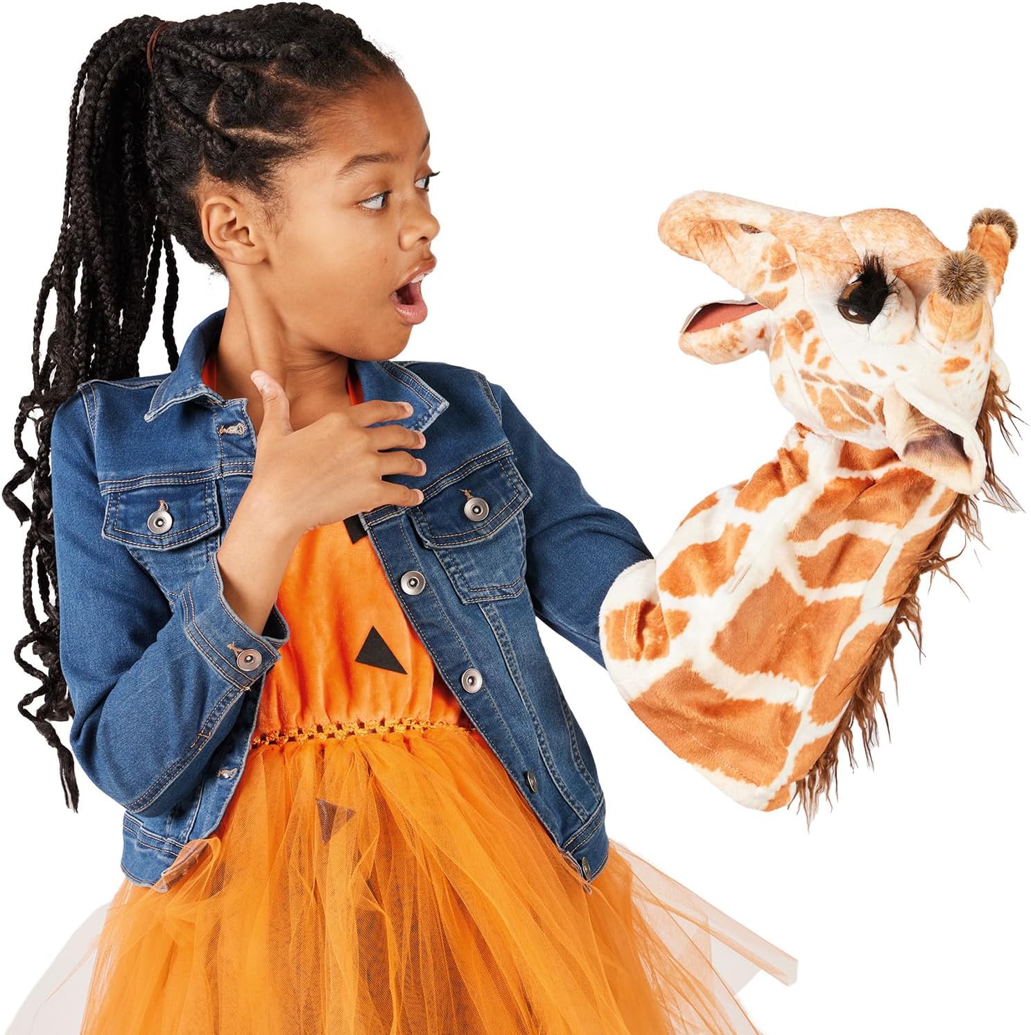 Reach for the heights of your imagination with the quintessential Giraffe Stage Puppet. This graceful animal rises above with a long neck printed in signature patterned velour with plush accents, luxurious long lashes, and a movable mouth. This puppet measures 10 x 10 x 17 inches (LxWxH).